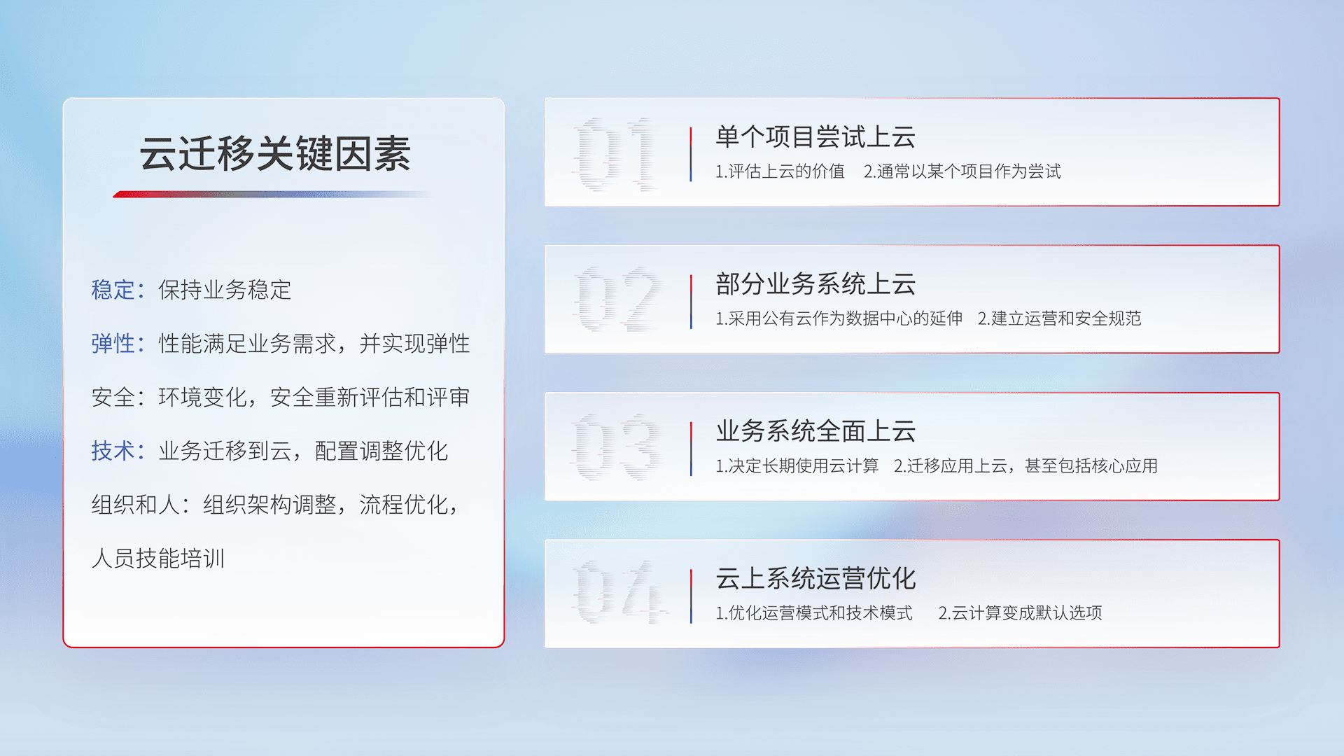 结合实际业务,,,从规划设计、、、云平台选型、、、、云原生改造、、、数据迁移、、、集成交付,,,迁移全过程为客户识别最佳上云路径,,,,做好风险识别管理,,设计网络架构、、、、身份权限、、、安全审计合规、、、操作审计、、、日志审计、、、、监控告警策略、、、多站点容灾设计等,,,,对云上基础设施进行整体规划,,,提升IT治理水平,,,以满足弹性、、、、高可用、、高性能的需求。。。。