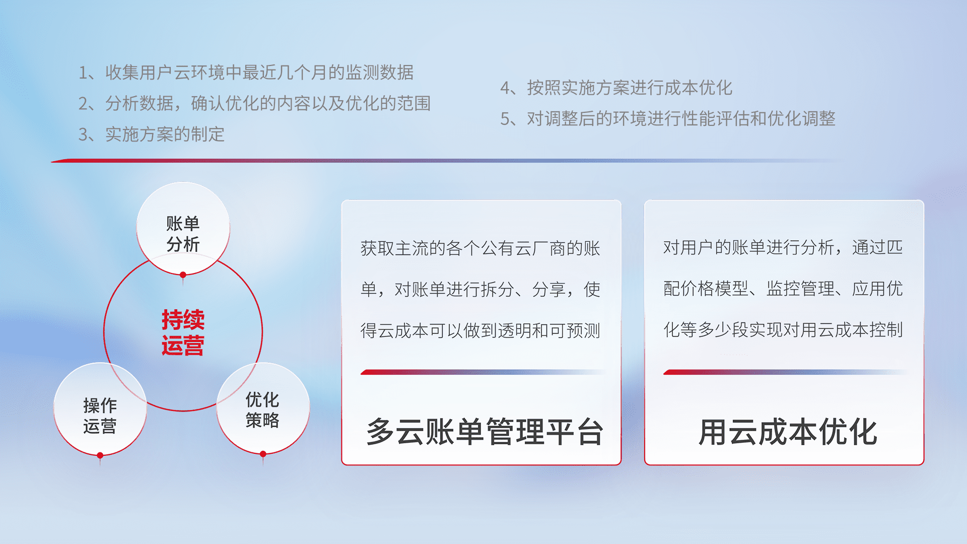 通过多云纳管,,,以统一的资源数据模型把客户的云资源进行抽象和封装,,进而实现对多云资源的统一操作,,,,保障云资源管理的可靠性、、稳定性与可用性。。。。量身定制化运维内容,,,配置、、、、开发运维、、、补丁管理、、备份、、、监控、、认证和访问管理、、、审计和日常巡检等,,,保障在用云过程中的可靠度,,,,稳定度以及高可用率。。。
